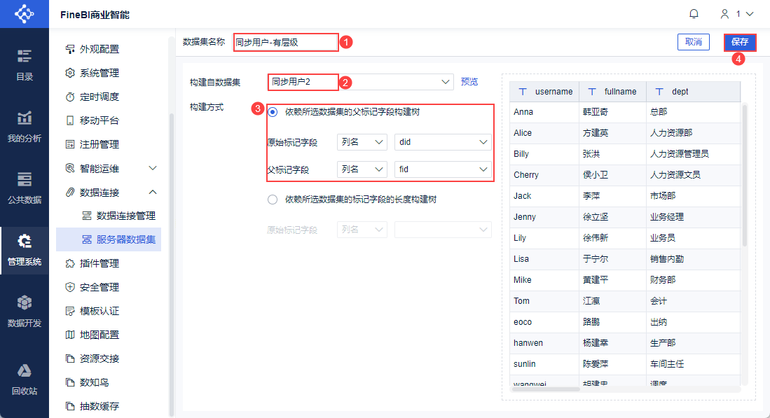 设置数据集名称为「同步用户-有层级」,构建自数据集「同步用户2」,原始标记字段为「did」,父标记字段为「fid」,如下图所示: