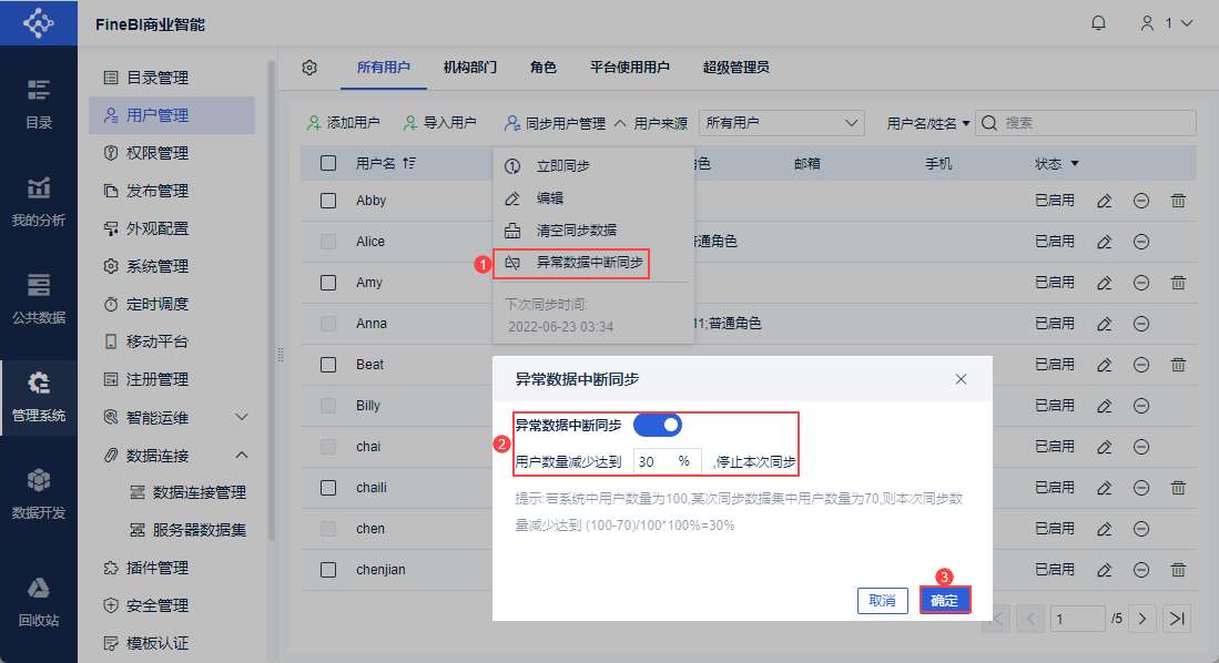 例如系统中原有100个同步用户(不包含手动添加/导入的用户数),设置为30%,即同步减少30(100*30%)个用户及以上,就会停止本次同步。
