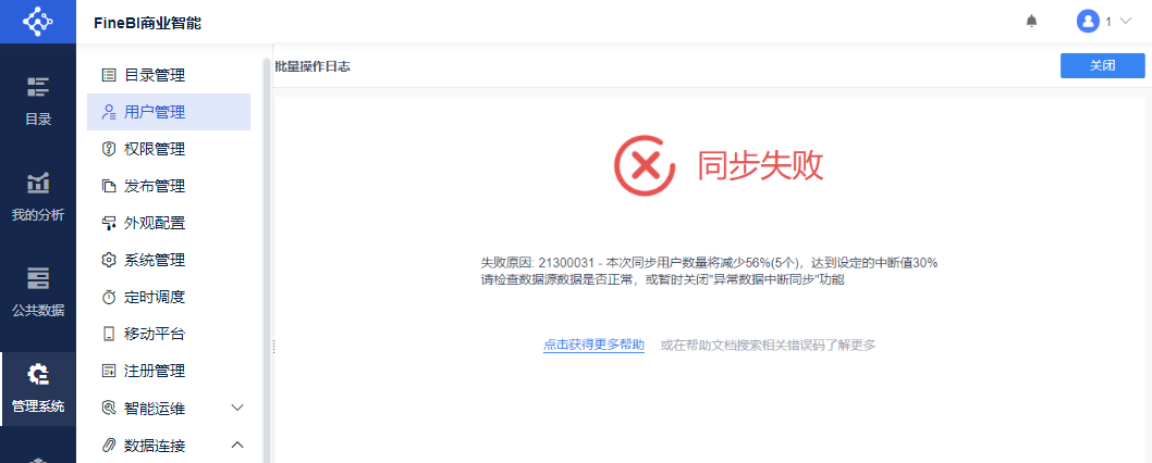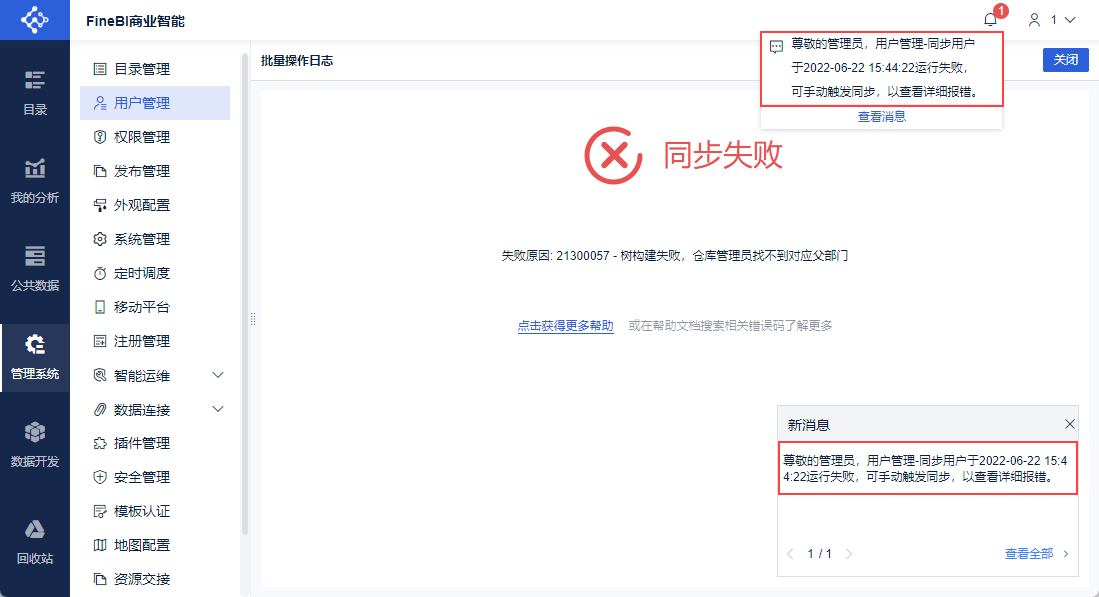 以上情况需要及时通知到对应的管理员,因此FineBI提供「同步失败提醒」功能。
