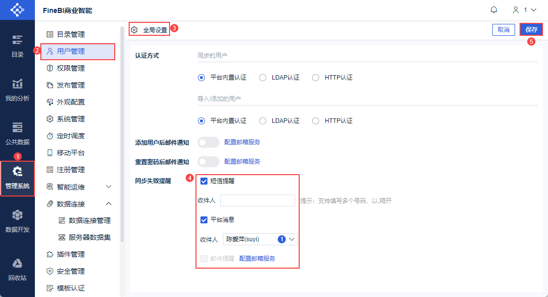 管理员登录FineBI系统,点击「管理系统>用户管理>全局设置」,配置同步失败提醒推送的接收人,点击「保存」,如下图所示: