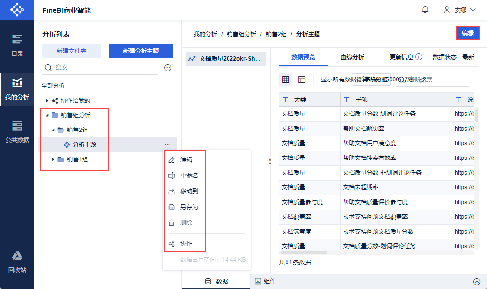 可对我自己创建的主题进行编辑、重命名、移动、另存、删除、协作给他人等操作。