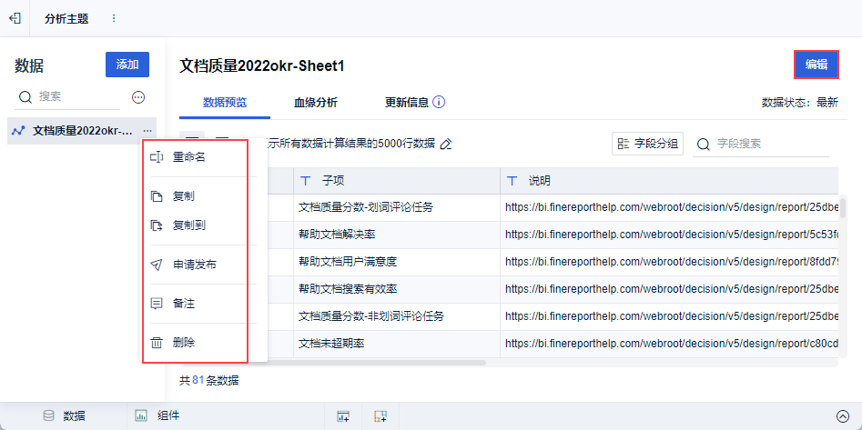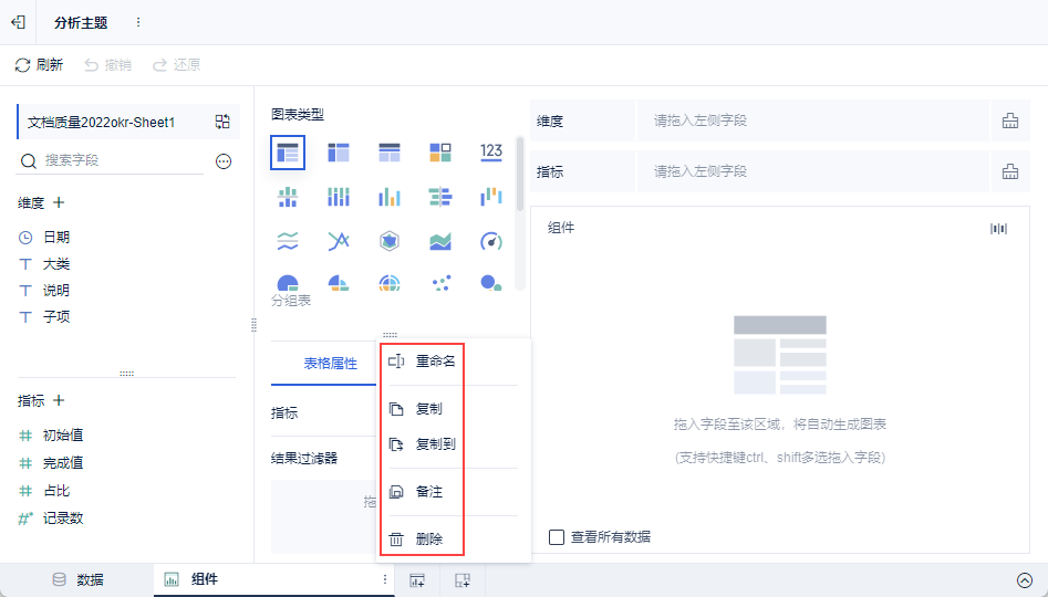 在主题编辑界面,分析用户可以在主题中添加数据,数据来源可以是当前工程/本地Excel文件。支持批量选择。