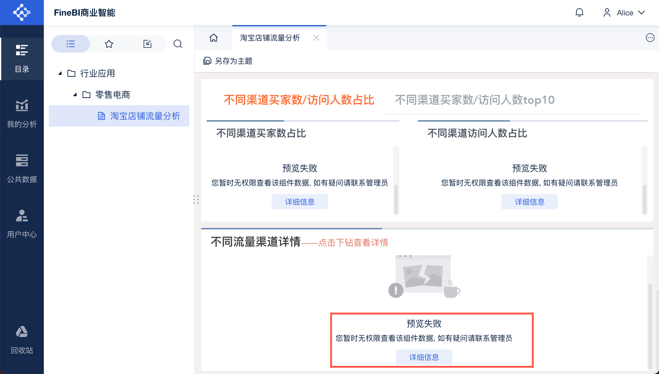 「淘宝店铺流量分析」仪表板,使用了「公共数据>行业数据>零售电商>天猫美妆店铺分析」文件夹中的数据。因此需要给用户 Alice 分配该文件夹的组件数据权限。