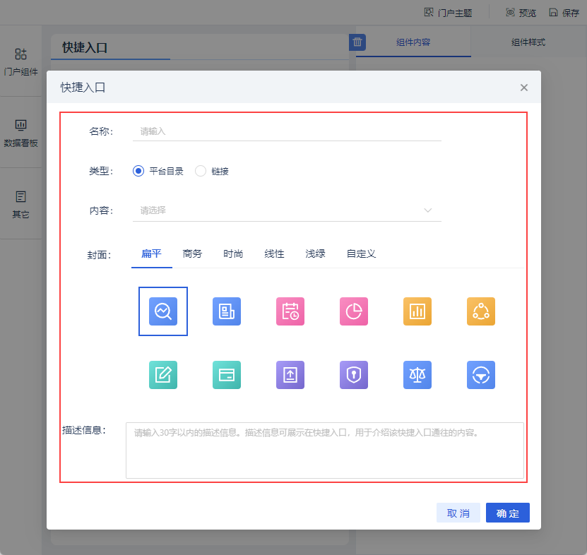 2)自定义:组件样式不跟随「门户主题」的切换而变化。组件样式包括组件标题、标题文本、标题样式、组件背景和入口排列方式。