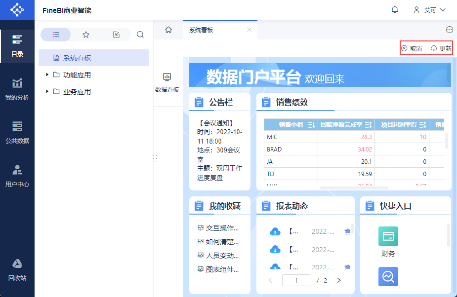 点击「更新」,则该用户自定义的数据门户看板被保存。无论该看板内容发生什么变化, 用户日后查看该看板时,均显示当前自定义的样式和内容。