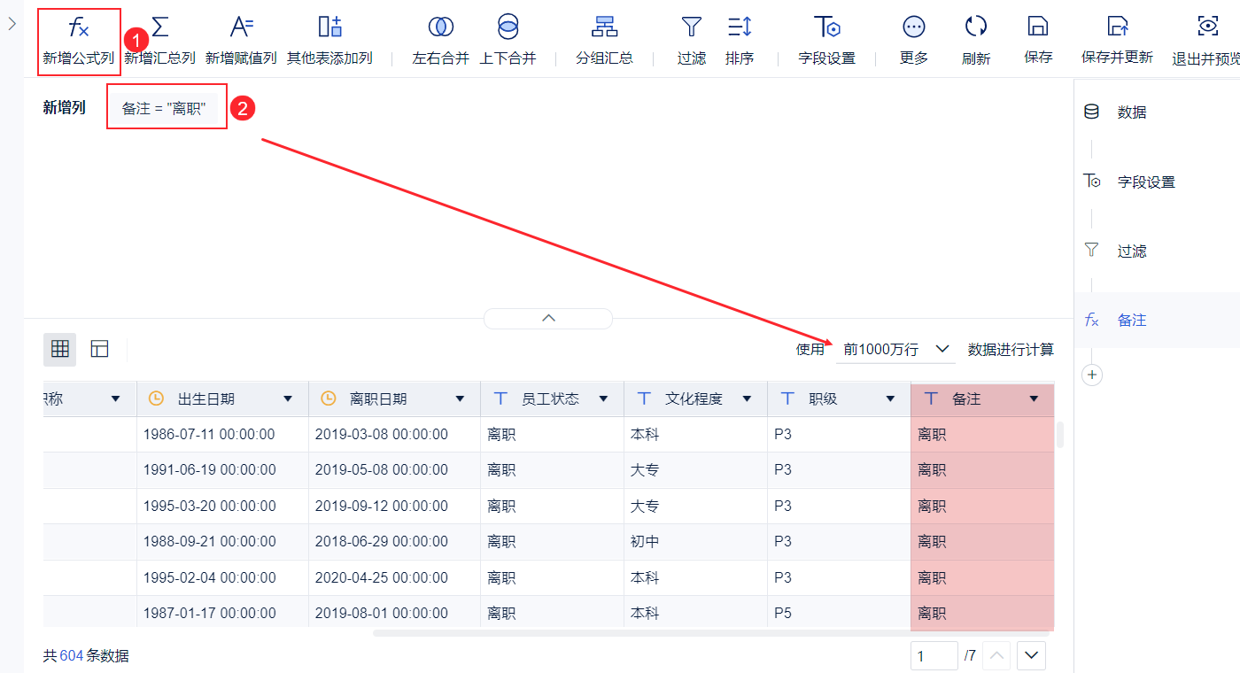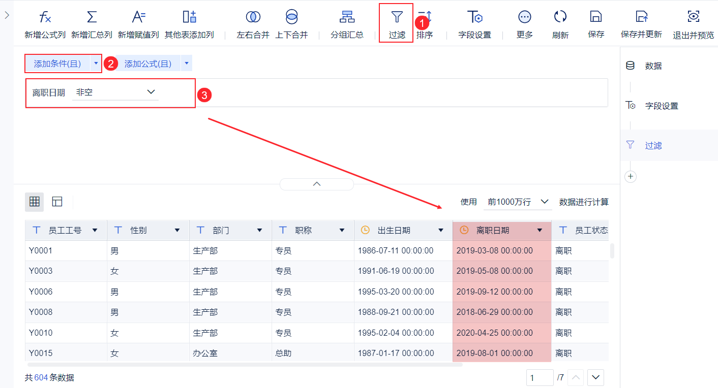 2)计算期末累计离职人数:复制「记录数」字段,重命名为「期末累计离职人数」,并对其进行明细过滤。过滤条件如下图所示: