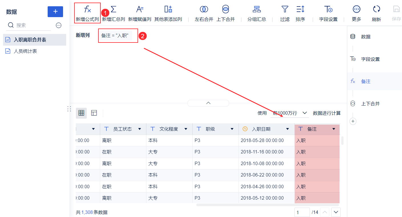 1)再添加下载的示例数据「人员统计表」,重命名为「入职离职合并表」,如下图所示: