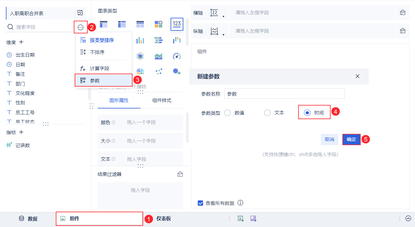 添加组件,进入组件界面添加时间参数,操作如下图所示: