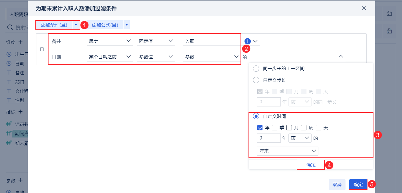 1)计算期末累计入职人数:复制「记录数」字段,重命名为「期末累计入职人数」,并对其进行明细过滤。过滤条件如下图所示: