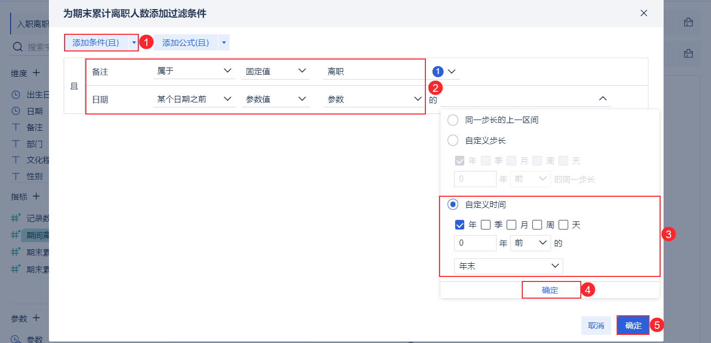 复制「记录数」,将其重命名为「期间离职人数」。对其进行明细过滤,筛选出「备注为离职」且「日期属于过滤组件全年」的数据,如下图所示: