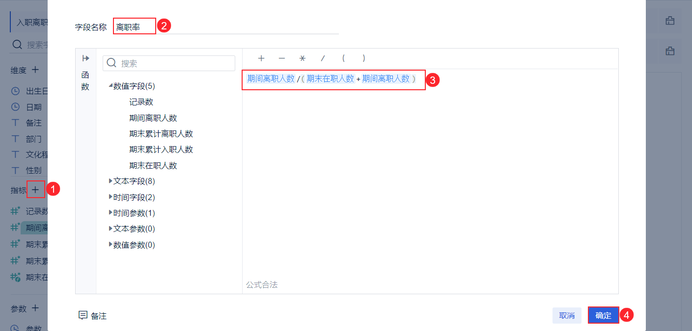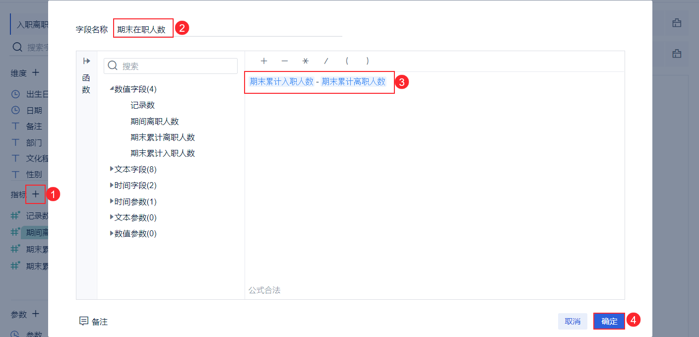 3)添加计算字段,期末在职人数=期末累计入职人数-期末累计离职人数。如下图所示: