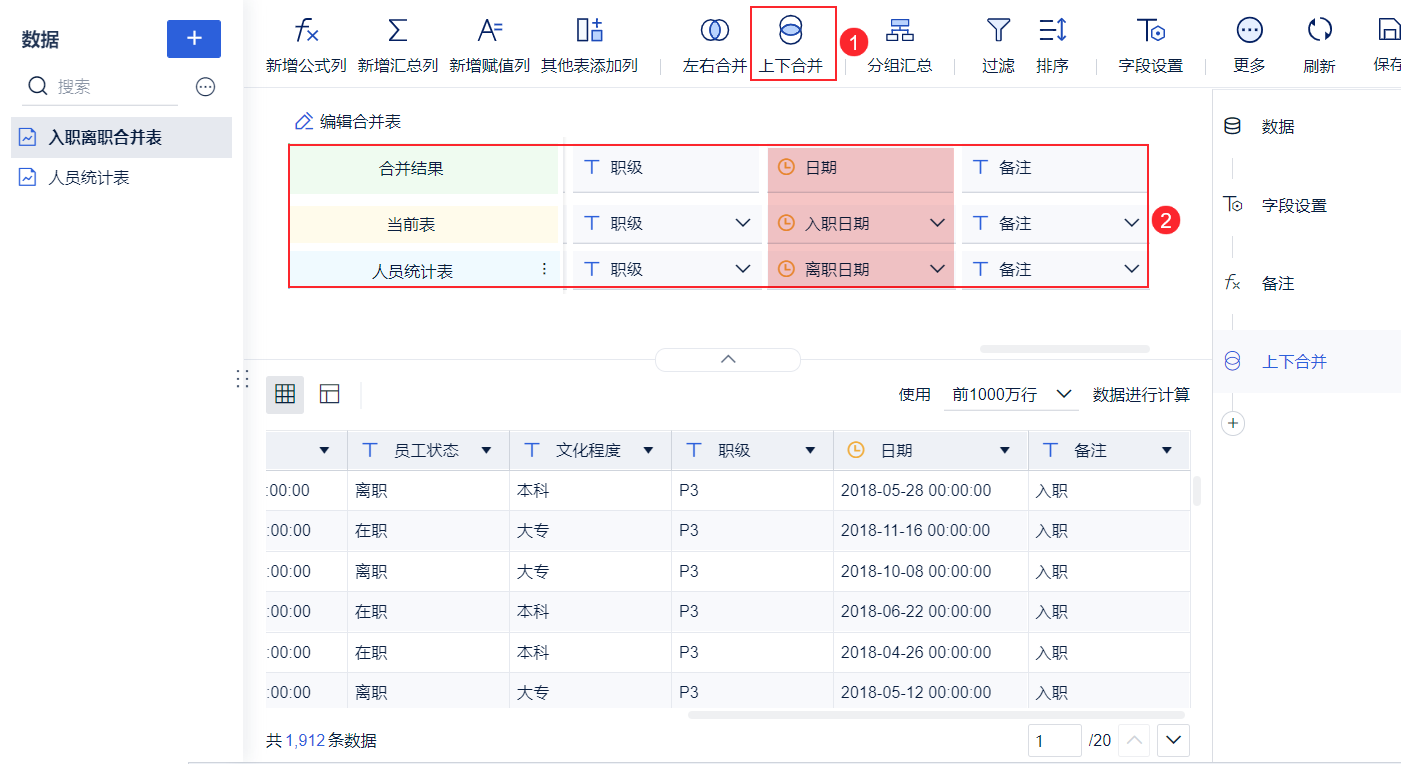 4)与「离职信息表」进行上下合并,将入职日期与离职如期合并到一列中,并将合并结果改为「日期」。如下图所示: