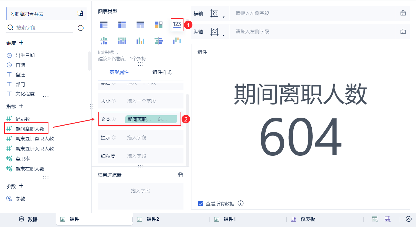 2)分别制作「离职率、期间在职人数、期间离职人数」的指标卡(制作方法参见:KPI指标卡),制作「期间离职人数」的指标卡操作如下图所示,其他指标卡的制作同理。