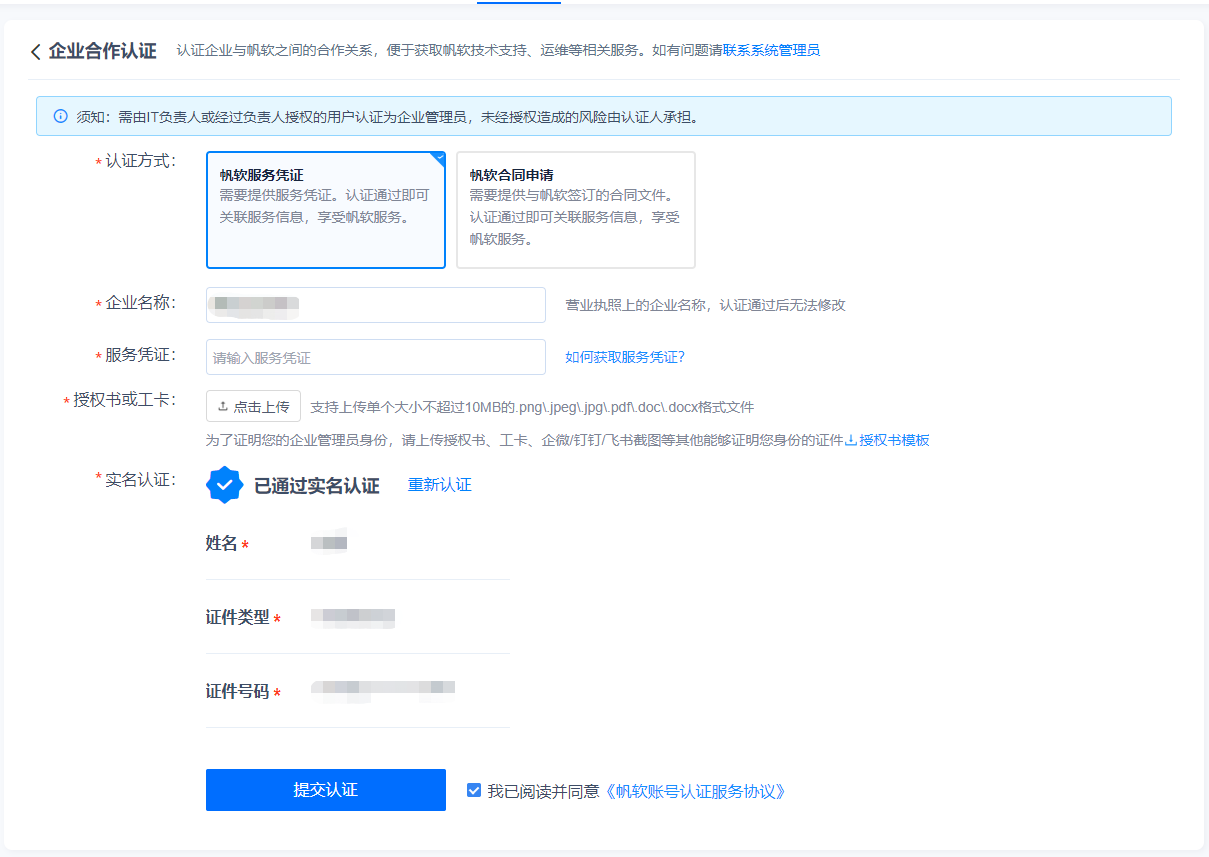 2)「认证方式」选择「帆软服务凭证」或「帆软合同申请」,并输入您的企业名称以及 服务凭证 ,上传授权书或工卡,并进行实名认证,提交认证,如下图所示: