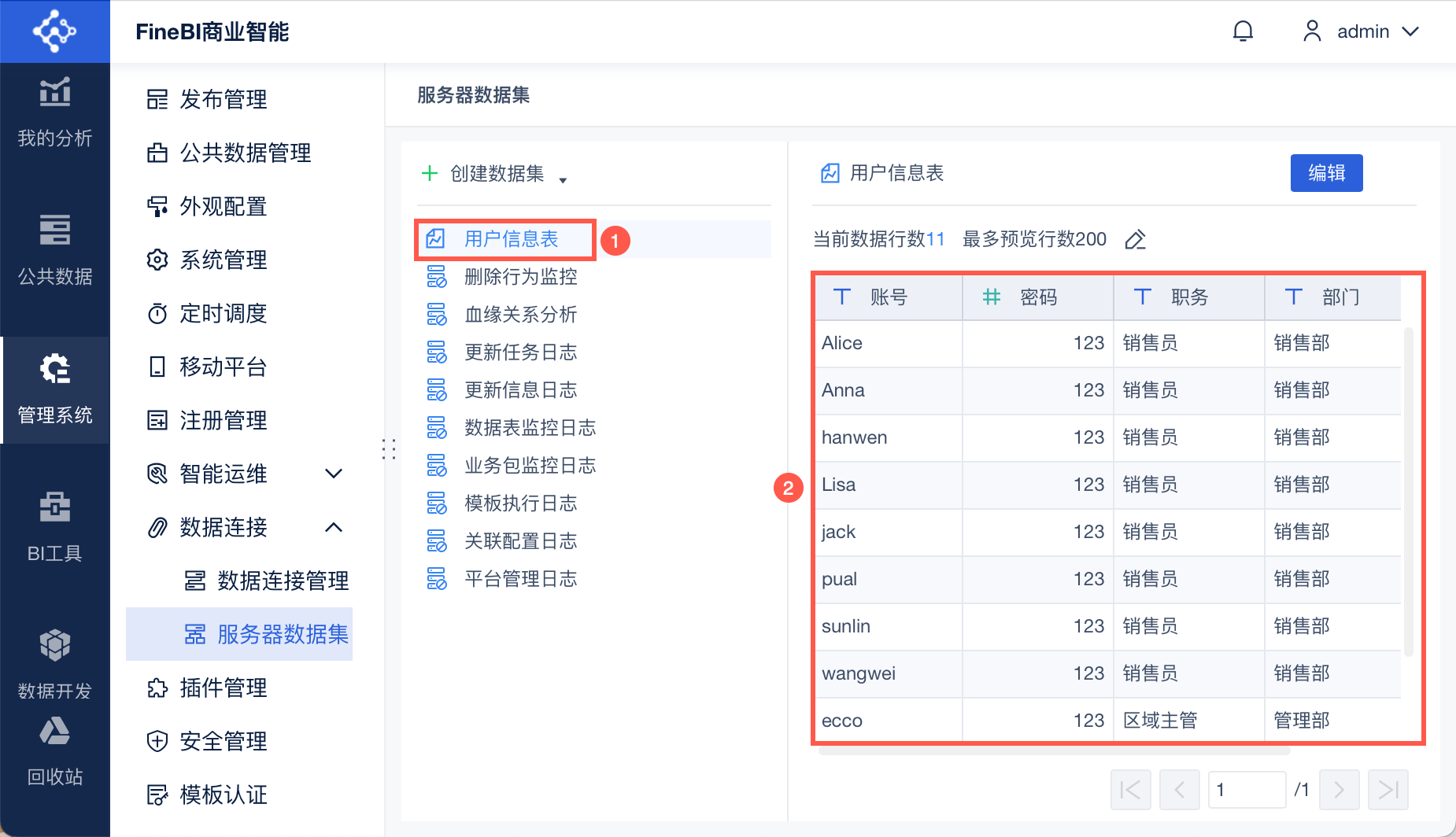 选择添加的服务器数据集「用户信息表」,并设置对应的「账号、密码、部门、职务」等,点击「确定」。如下图所示: