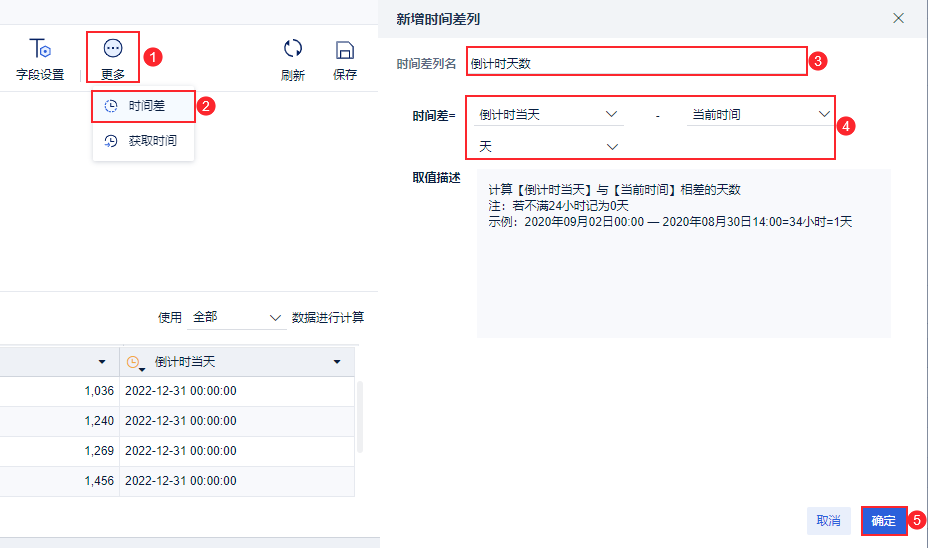 新增「时间差」步骤,命名为「倒计时天数」,时间差=「倒计时当天-当前时间」且以天为单位,点击「确定」,如下图所示: