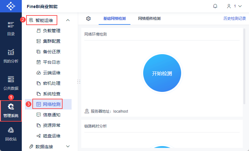 一般 FineBI 工程都是部署在中间件上,依托 JDBC 连接数据库,用户通过互联网访问平台资源。因而在出现诸如模板响应慢等性能问题时,需要定位是不是网络问题导致的。FineBI 中新增内置了系统运维插件,帮助提供「网络检测」功能,当遇到性能问题时,可通过该工具一键检测是否存在网络问题。如下图所示: