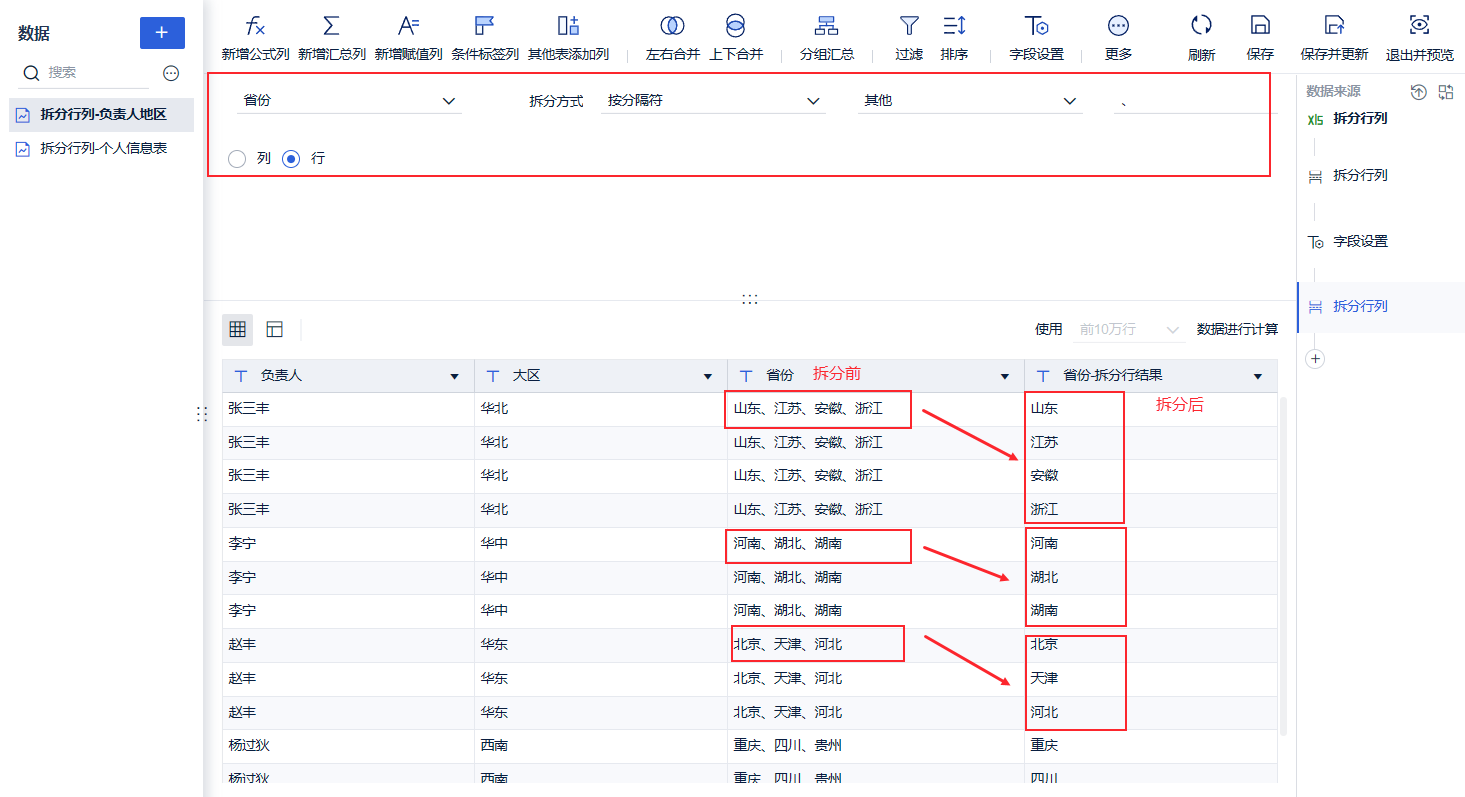 在日常使用时经常需要将数据拆分,例如:将「中国江苏无锡」拆分为「中国」「江苏」「无锡」,FineBI 新增拆分行列功能,在编辑数据时可以快速将字符串快速按我们的需求进行分割。如下图所示: