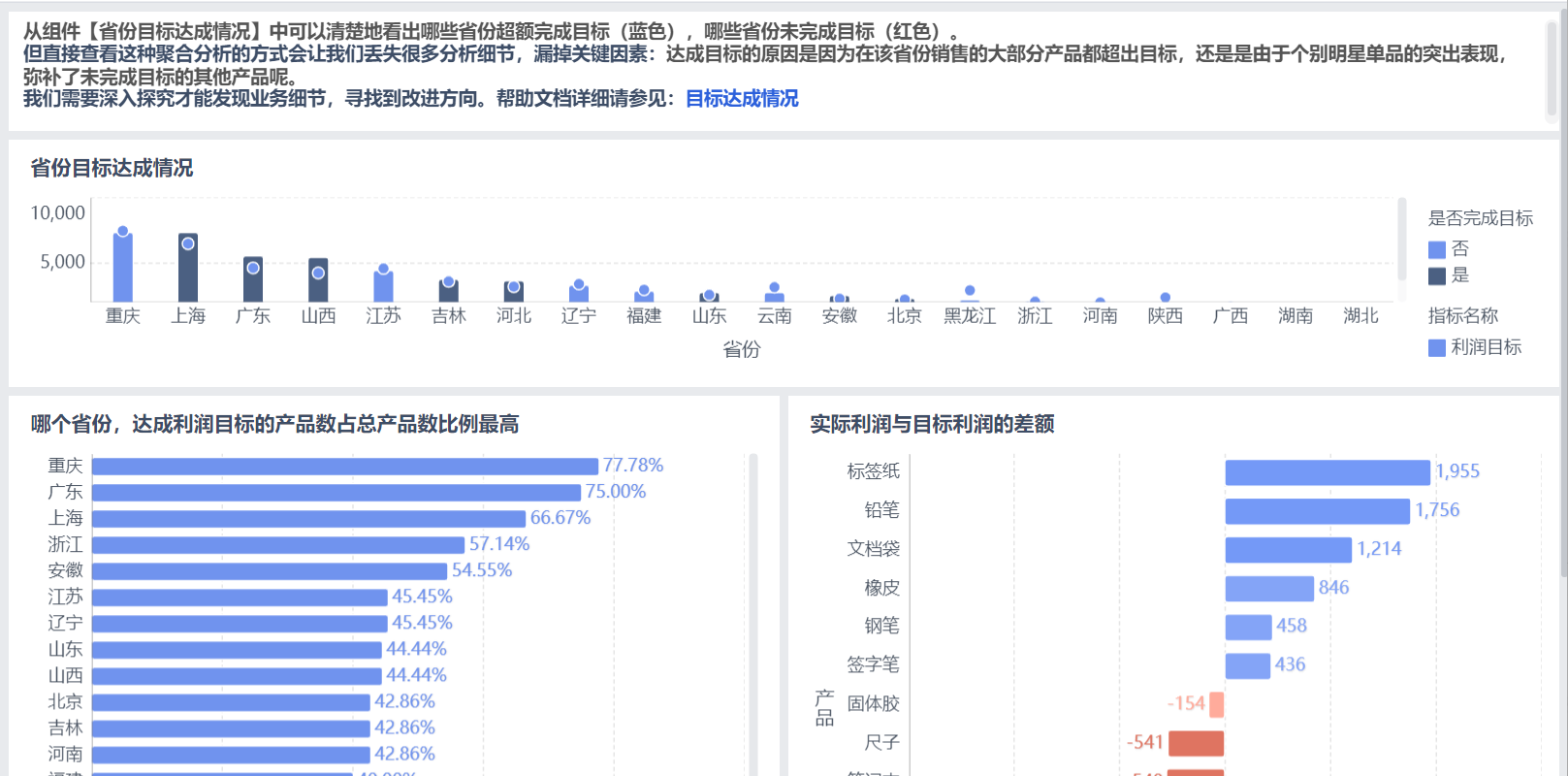 省份达成目标的原因是因为在该省份销售的大部分产品都超出目标,还是是由于个别明星单品的突出表现,弥补了未完成目标的其他产品。如下图所示: