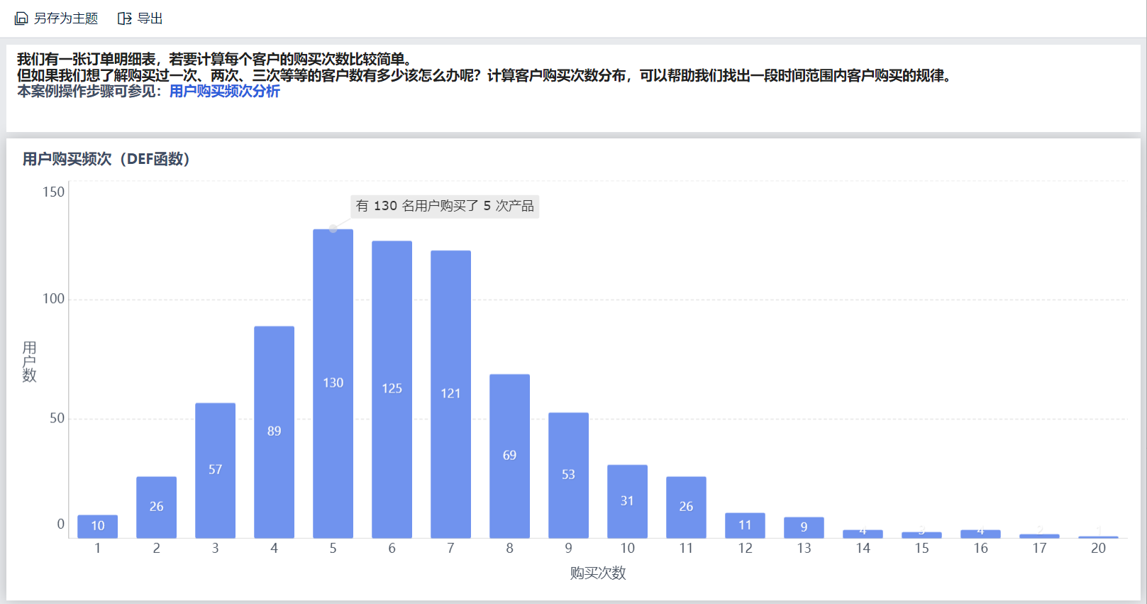 如何通过一张订单明细表计算出购买过一次、两次、三次等等的客户数?计算客户购买次数分布,可以帮助我们找出一段时间范围内客户购买的规律。如下图所示: