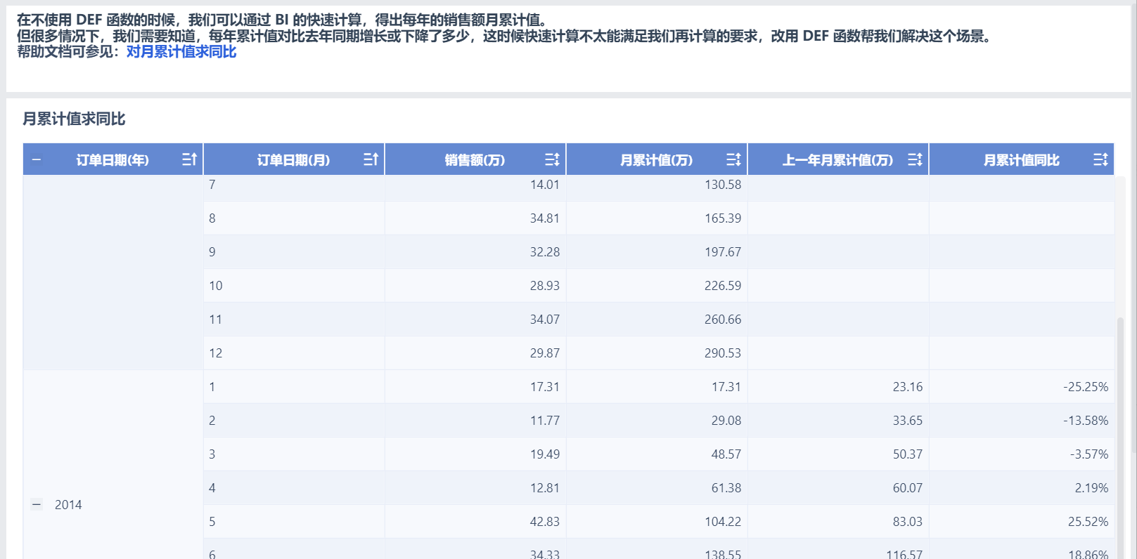 对比今年的累计销售额与去年同期的累计销售额是非常常见的场景,有 DEF 函数后这类场景实现不再困难。如下图所示: