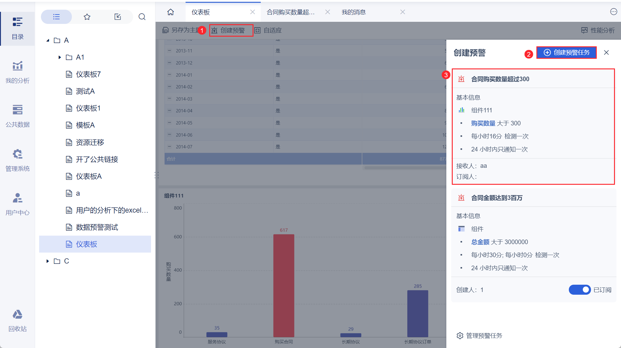 数据预警插件新增可对部分图表设置预警任务,对图表数据实现监控预警,满足更多用户的日常工作使用需求,如下图所示: