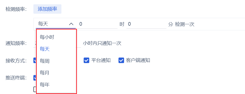 检测频率支持明细设置并支持设置多种检测频率,更加符合不同企业人员的预警需求。如下图所示: