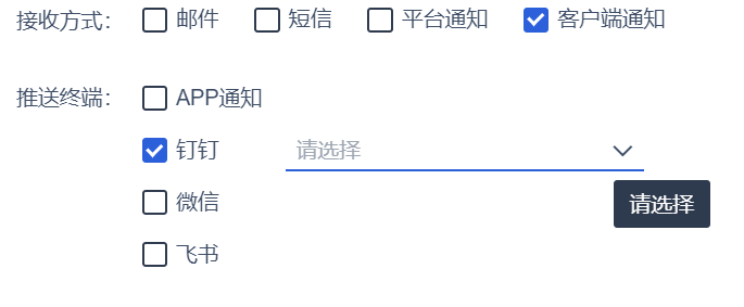 支持邮件、短信、平台通知、客户端通知。其中客户端通知支持钉钉、飞书、企业微信、App通知四种方式,满足更多用户的使用需求。如下图所示: