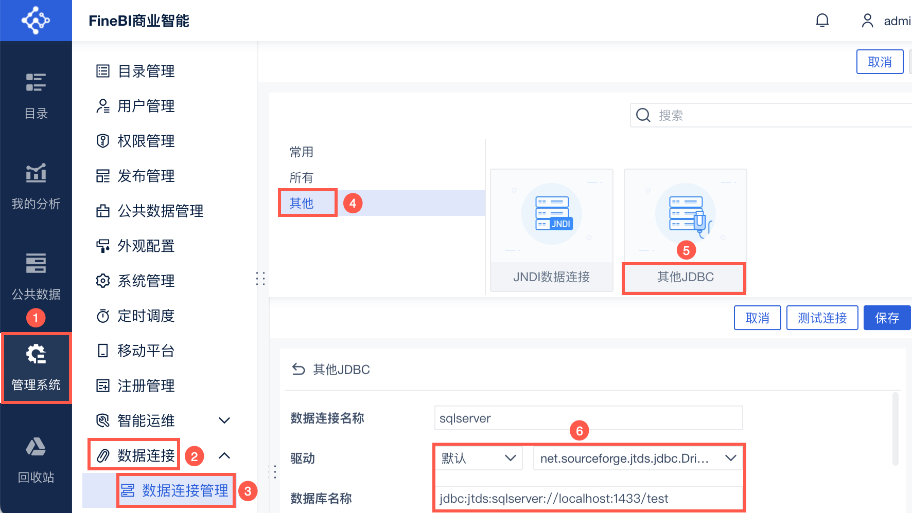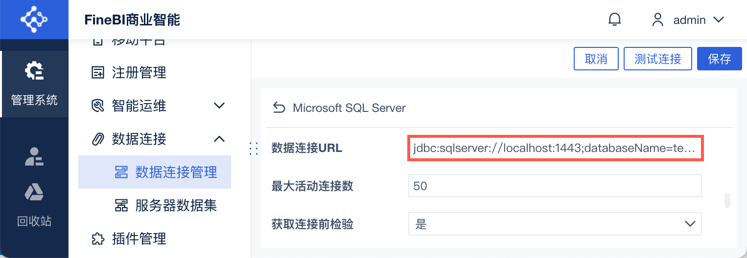 使用「 jtds-1.2.2.jar」驱动连接数据库时,数据库类型选择「其他JDBC」,手动输入「 URL 」和「驱动器」。