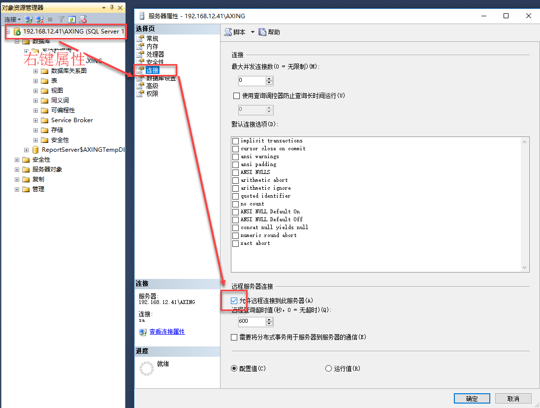 进入数据库所在服务器查看对象资源管理器,检查是否允许远程连接。