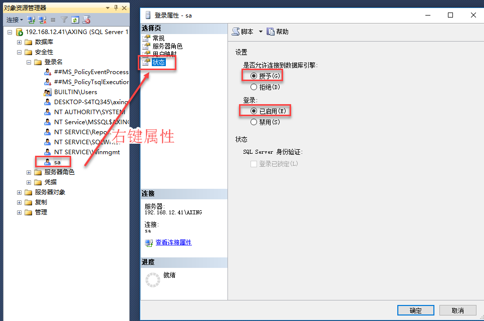 数据连接中使用的用户密码,需要授权允许连接到数据引擎,并且登录状态是已启用。
