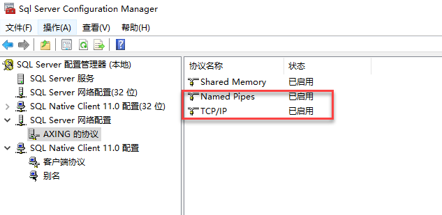 打开 SQL server 配置管理器,检查 SQL server 网络配置是否启用 Named Pipes 和 TCP/IP 。