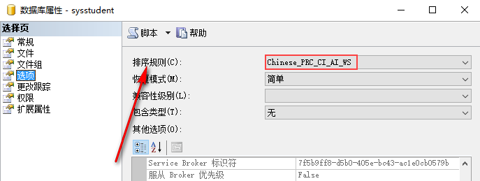 若乱码,则需要修改排序规则。右键数据库,点击「属性>选项」,设置「排序规则」。如下图所示: