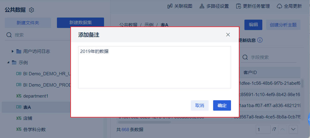 | 备注 | 可以给该数据集添加重要信息备注,要查看备注时也是点击「备注」查看。
