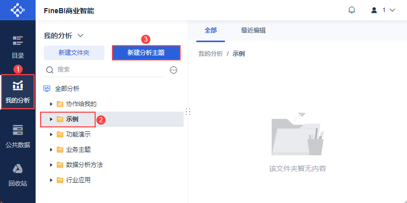 管理员登录FineBI系统,点击「我的分析」,选中某个文件夹,点击「新建分析主题」。如下图所示: