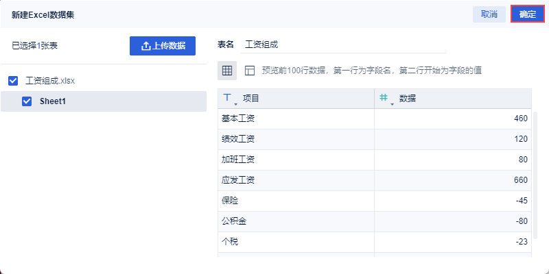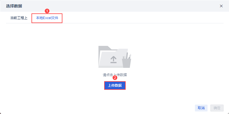 点击「本地Excel文件>上传数据」,上传表数据。如下图所示: