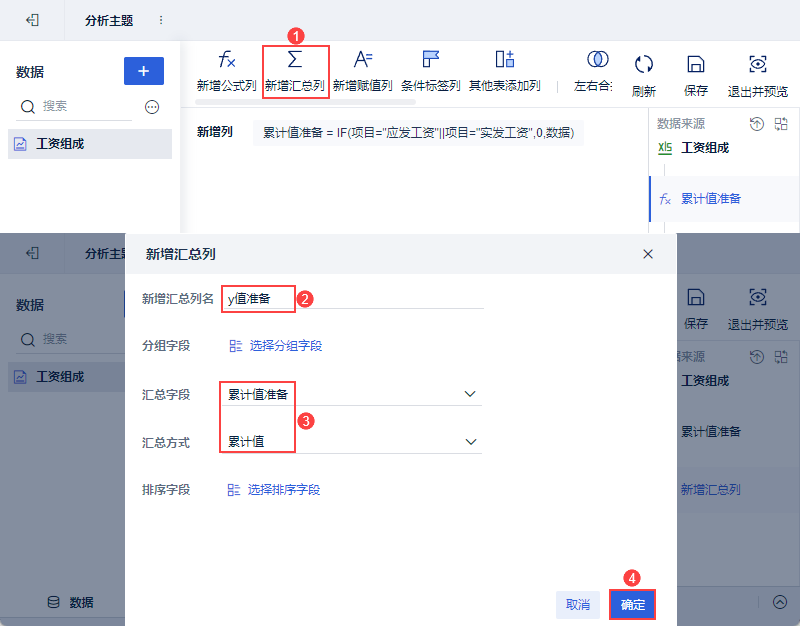 选择「新增汇总列」。对「累计值准备」字段进行累加。如下图所示: