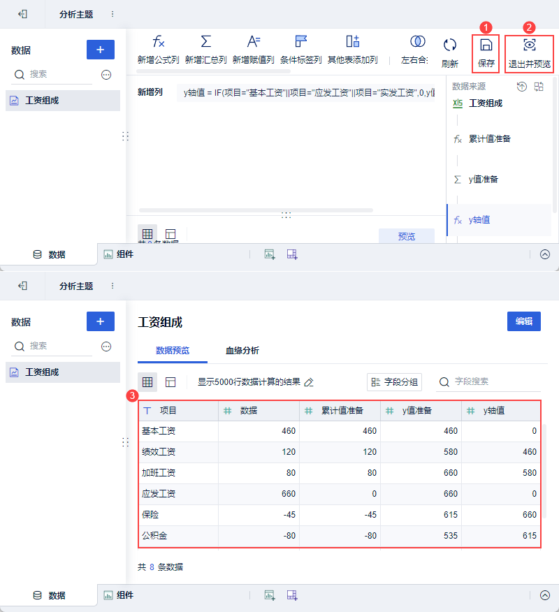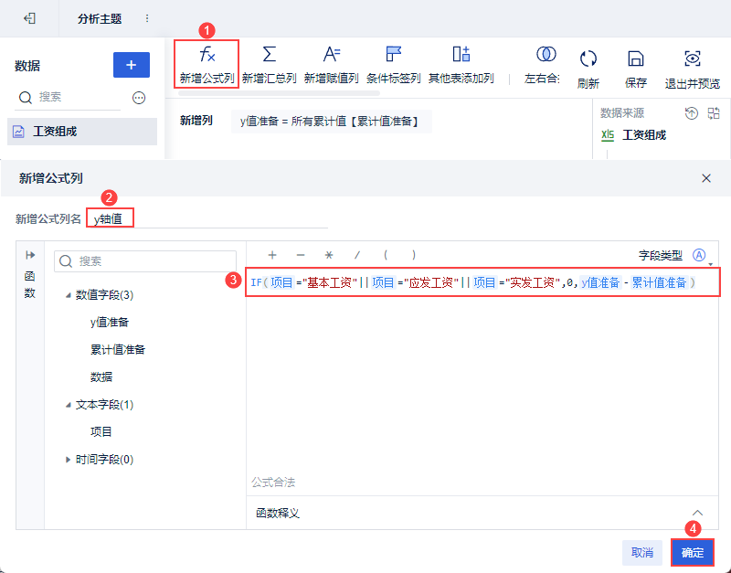 注:公式中的「项目」、「y值准备」、「累计值准备」字段是通过下图左侧的同名字段点击生成的,不能直接复制公式。