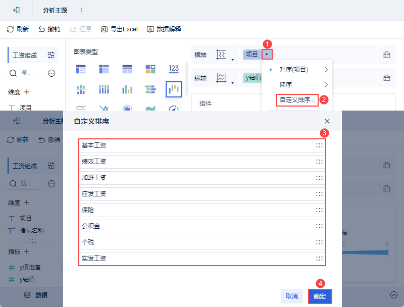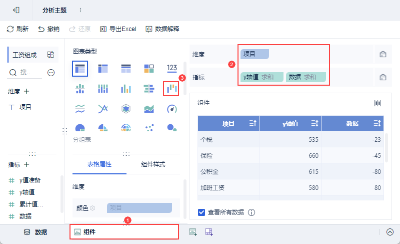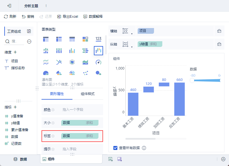 2)将「项目」字段拖入到维度中,「y轴值」、「数据」字段拖入到指标中。