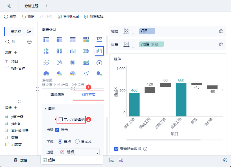 点击「组件样式>图例」,取消勾选「显示全部图例」。如下图所示: