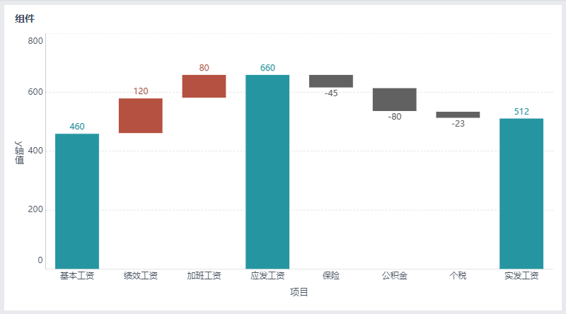 瀑布图采用绝对值与相对值结合的方式,来表达数个特定数值之间的数量变化关系。这种效果的图形能够在反映数据多少的同时,直观反映出数据的增减变化过程。