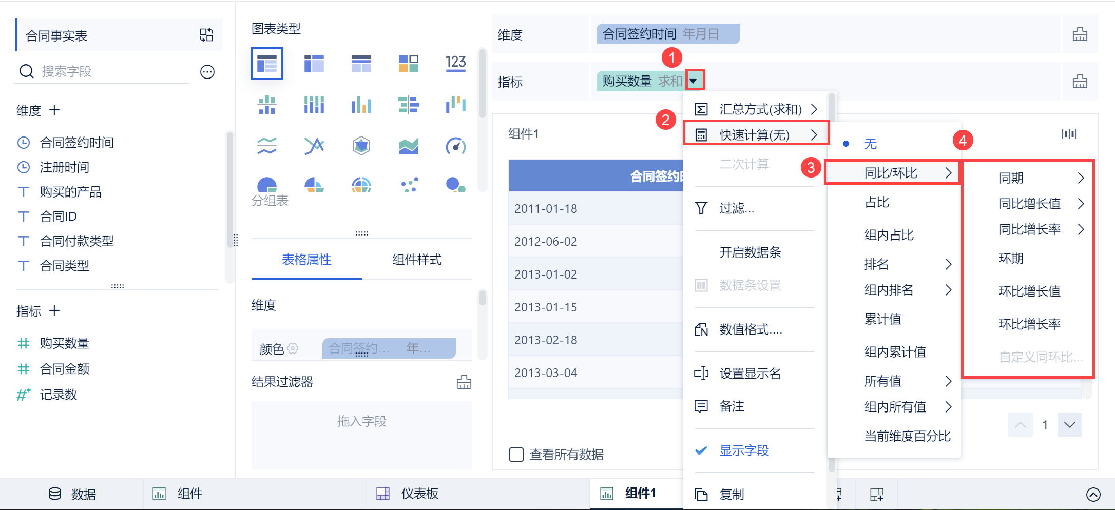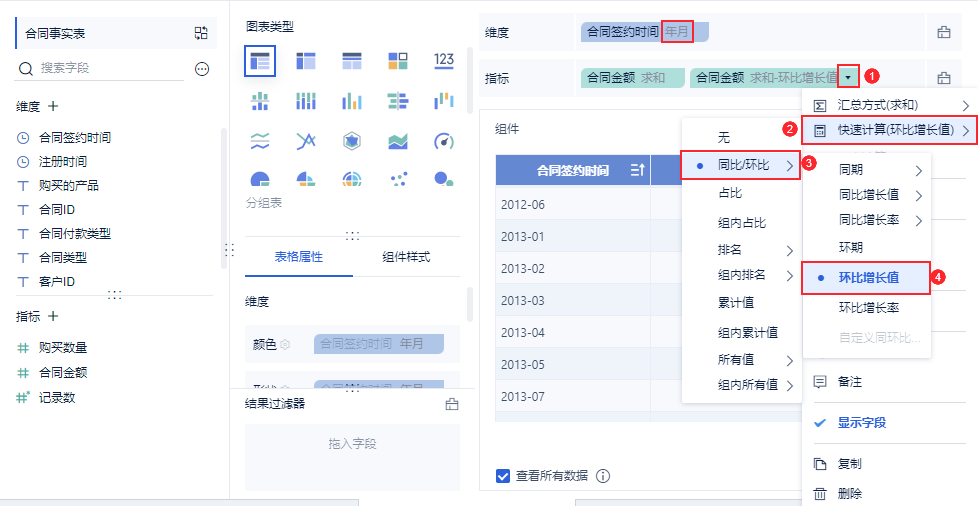 1)维度中拖入「合同签约时间」,更改分组为「年月」,对合同金额点击「下拉>快速计算>环期」,如下图所示: