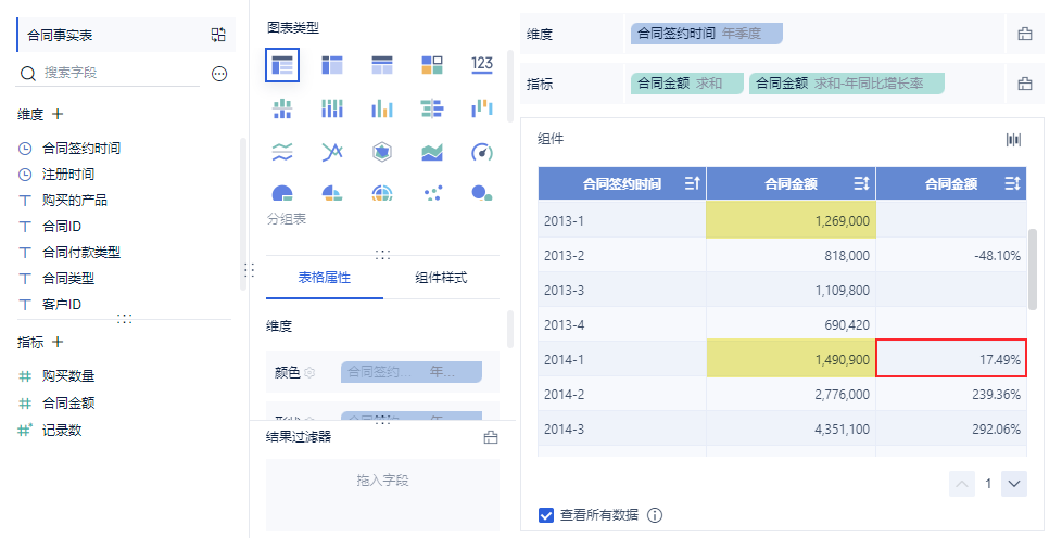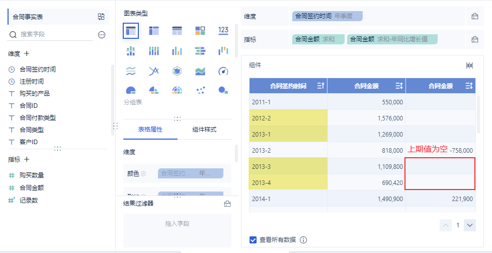 维度中拖入「合同签约时间」,更改分组为「年季度」,为方便对比,在指标栏拖入两个「合同金额」,对后一个「合同金额」字段求「年同期」,如下图所示: