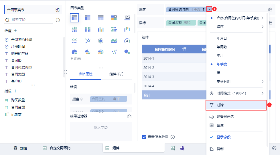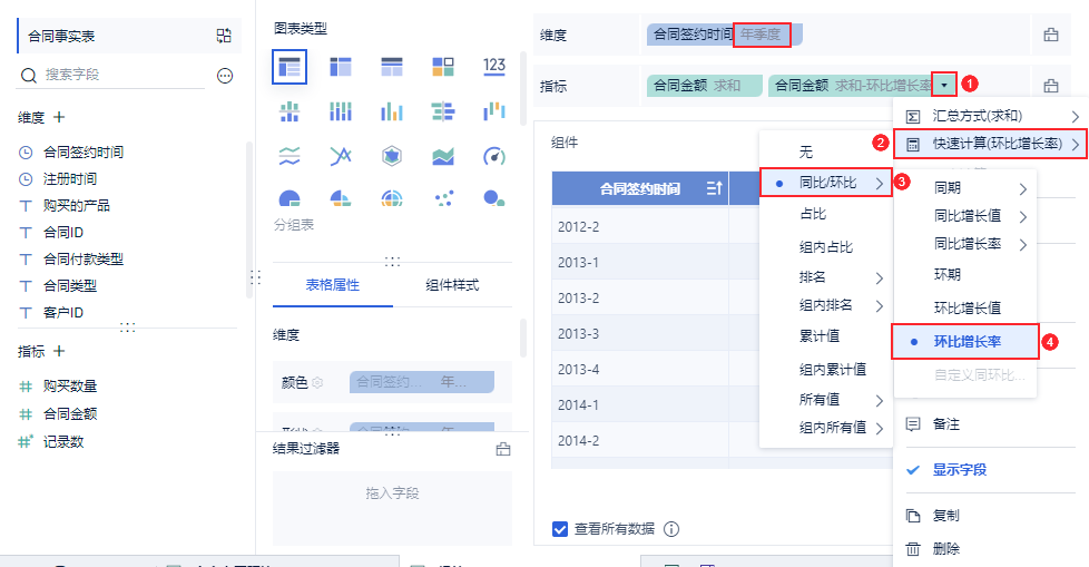 1)维度中拖入「合同签约时间」,更改分组为「年季度」,对合同金额点击「下拉>快速计算>同比/环比>环比增长率」,如下图所示: