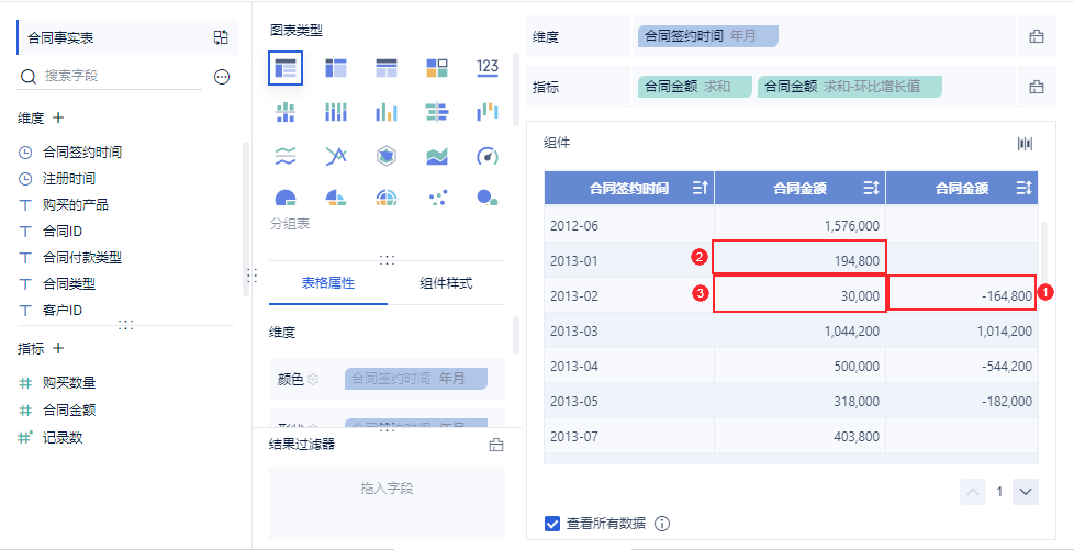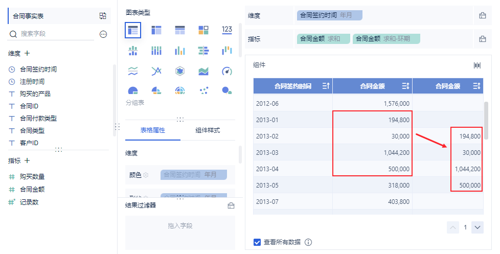 2)2013-02 的环期值为 2013-01 的合同金额值,效果如下图所示: