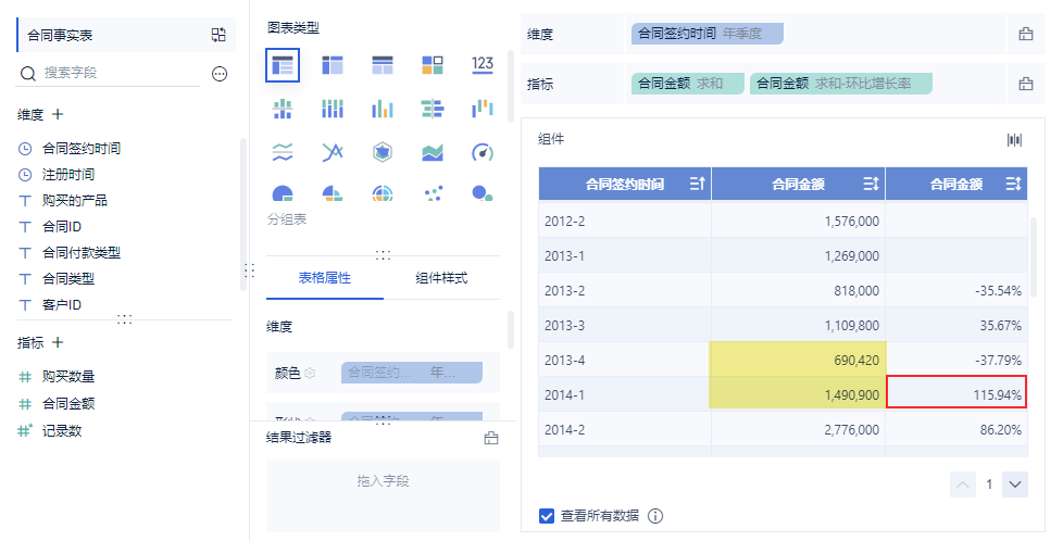维度中拖入「合同签约时间」,更改分组为「年季度」,对合同金额点击「下拉>快速计算>同比/环比>环比增长值」,如下图所示: