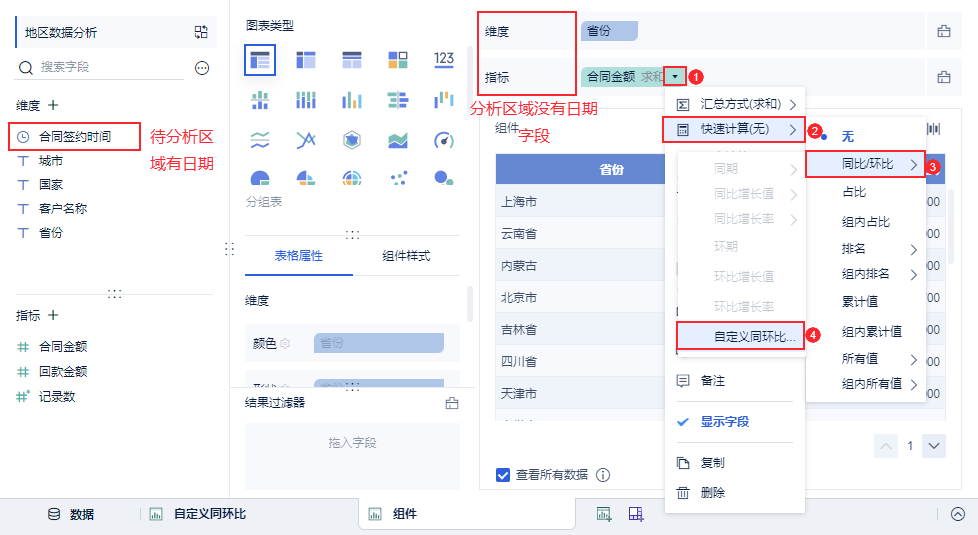 1)分析区域不包含「日期」字段,即维度栏为非「日期」字段时,且待分析区域有「日期」字段,支持通过自定义同环比的方式快捷计算「对比值、增长值、增长率」。