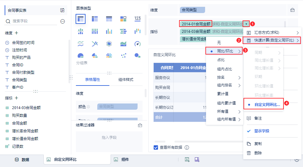 2)例如要计算「合同签约时间」为 2014年 1 月不同「合同类型」的「合同金额」相对于 2014 年 3 月不同「合同类型」的「合同金额」增长情况。