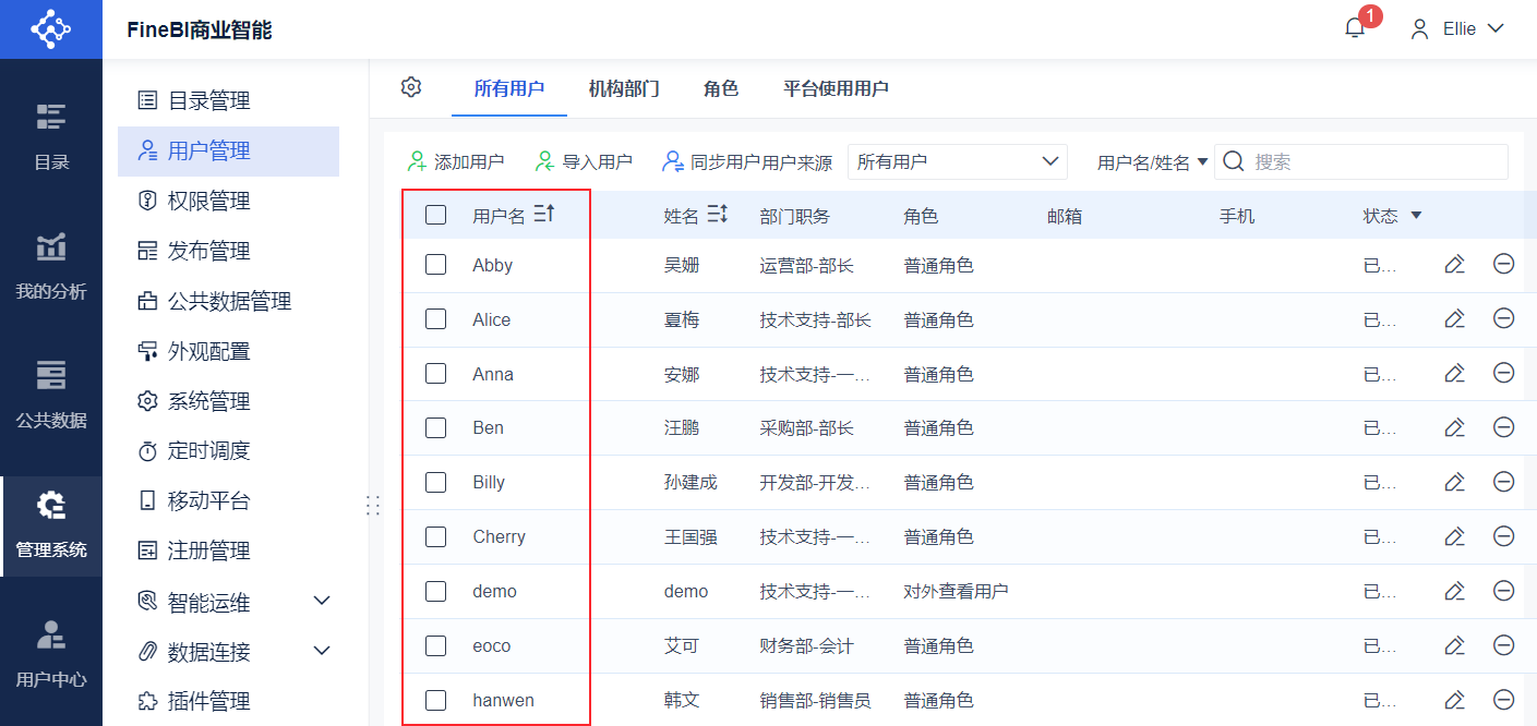用户是按自身的登录用户名作为权限依据的,因此需要将数据准备下对应的用户员工名添加进用户管理中,确保数据表中的用户都能够登录 FineBI 系统,如下图所示: