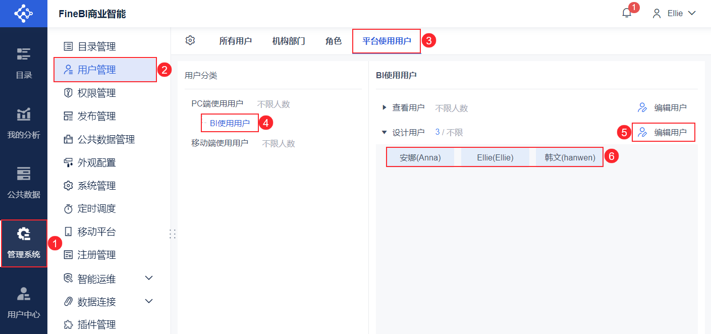 若「平台使用用户」中「设计用户」分类限制了人数,则必须执行本节操作,否则无法查看数据表/创建仪表板。